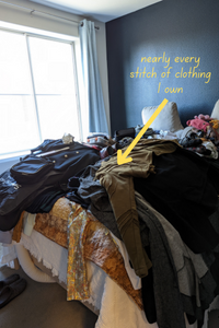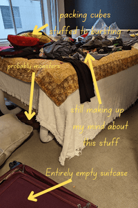 Then I started laying out three weeks’ worth of clothes. Oh, and also a bathing suit. And pajamas. And don’t forget the formalwear. And shoes. Undershirts. Sweaters. During the trial run, I had all my clothes stacked up on the bed such that the bed was almost entirely obscured. (See picture left.)